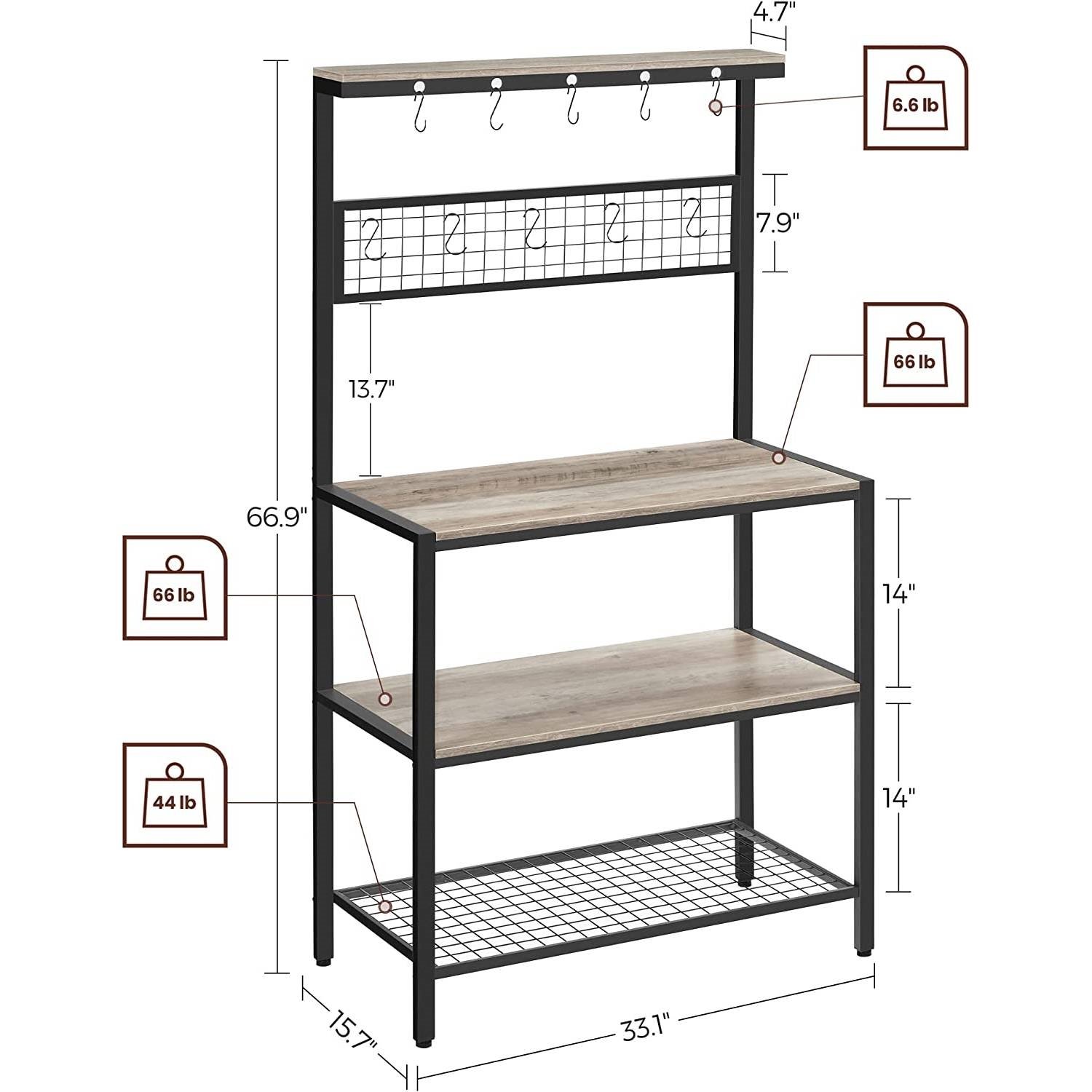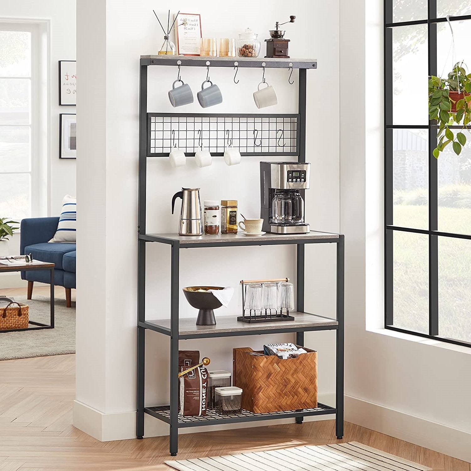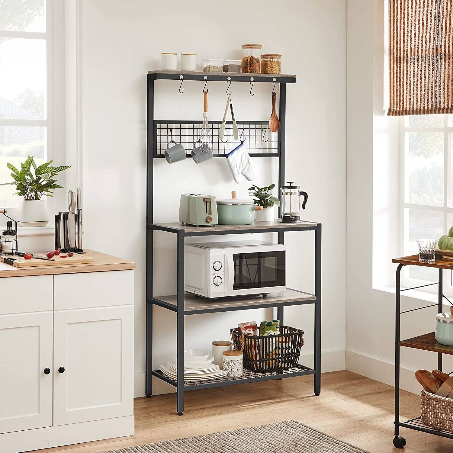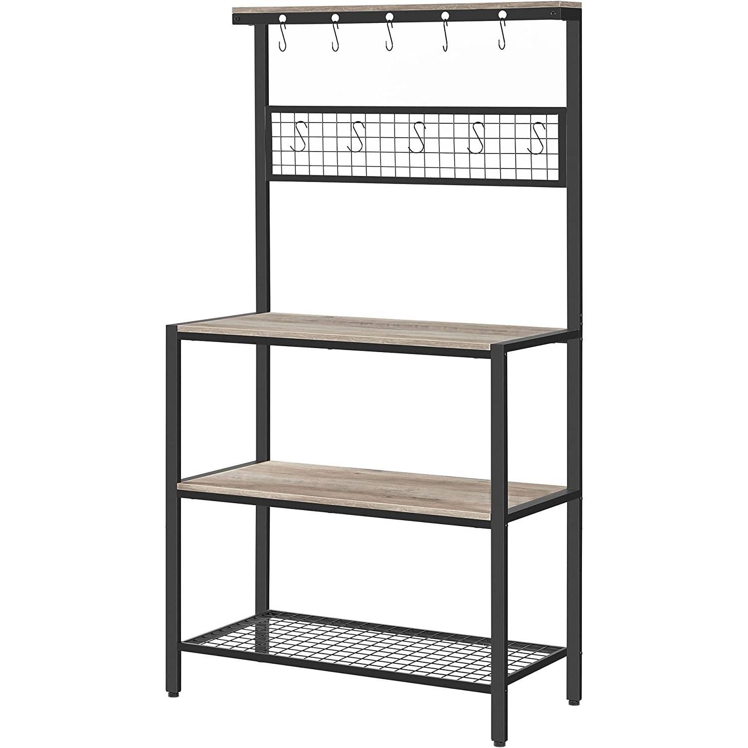 Create your insta-worthy dream kitchen with this Modern 3-Shelf Black Metal Light Grey Wood Kitchen Baker's Rack Microwave Stand. Combining an steel frame and wooden shelves, it adds uniqueness without losing the pleasant atmosphere for you to enjoy freshly baked pizza. Oven, Microwave, Coffee Machine: If all of these are essential items for you, donít worry! Strong steel frame and quality 15 mm thick particleboard have the strength, so you can put nearly all you need on this kitchen shelf: Place pots on the 3 shelves, customize the mesh panel by hanging cups and potholders, leave ladles and spatulas on the top hooks, and use the top narrow shelf for spice jarsónow it's up to you! You donít need to an expert on the assembly of this kitchen shelf, as it comes with numbered parts and step-by-step instructions to make it easy-peasy.